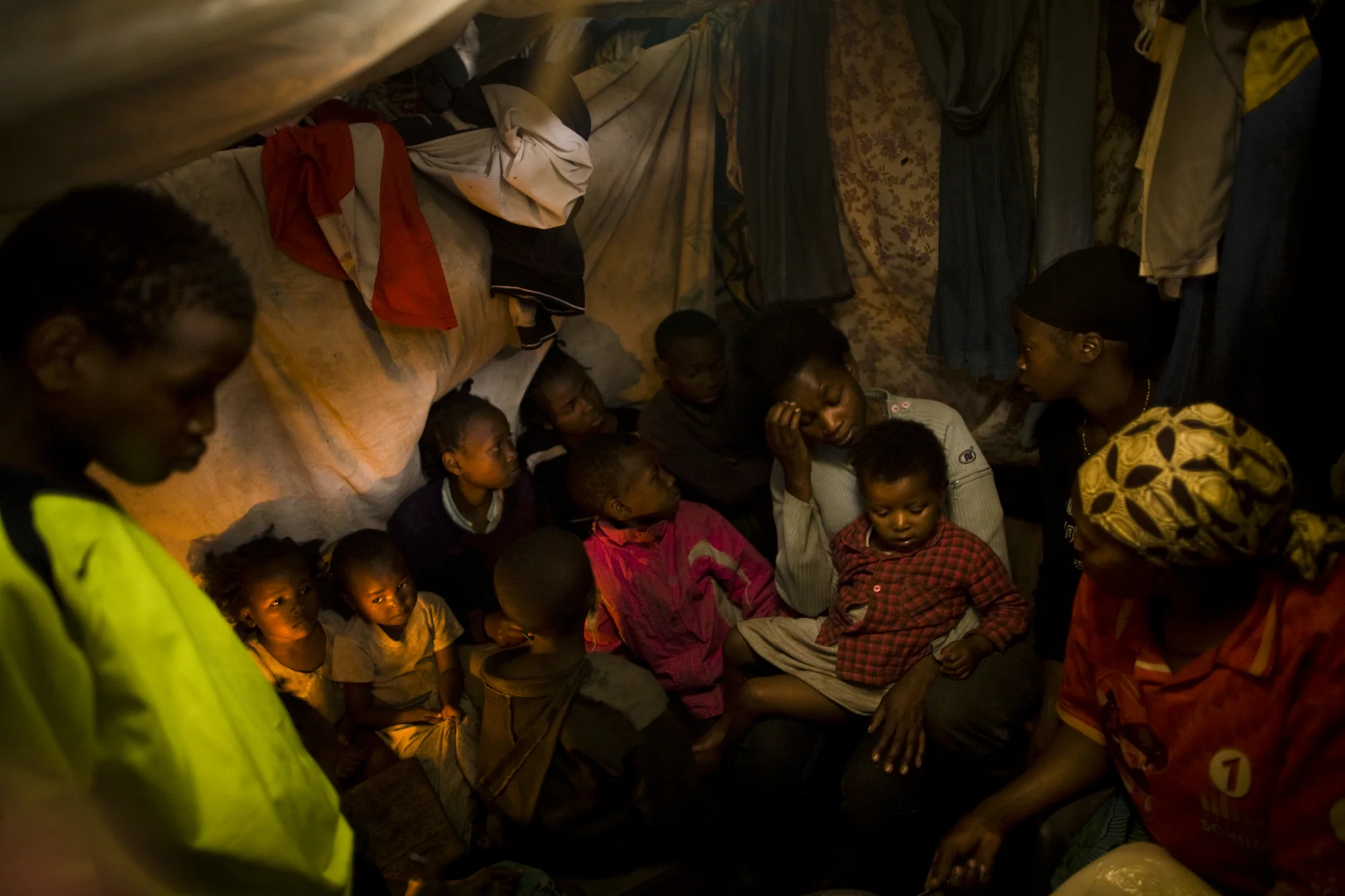 Rent for a mud shack started at about 1000 shillings. But later, for no reason, it could go up to 2000 shillings. Then later it could go up to 3000 shillings. This could happen within a single year. The houses were all mud huts, or made of scrap tin. They were very very small and very very close together. The spaces between the shacks were called corridors. The ground was dirt and garbage. It was cut by open sewers. People braided hair there. They washed clothes.
